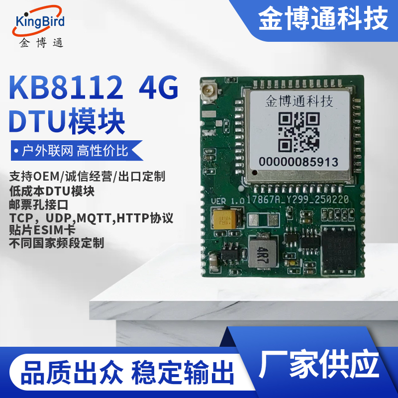 隨著物聯(lián)網(wǎng)的發(fā)展,越來越多的用戶單位需要將自己的產(chǎn)品配上4G模塊來上物聯(lián)網(wǎng)系統(tǒng),但用戶買來4G模塊后,需要進(jìn)行軟件和硬件的開發(fā),這得必須配上一位軟件工程師和一位硬件工程師,而且產(chǎn)品從開發(fā)到成熟,至少要半年、一年甚至兩年的時(shí)間,人力成本至少要投入20萬,而且耗時(shí)又長(zhǎng)。而我公司推出的KB8112 4G DTU模塊,是在4G模塊基礎(chǔ)之上將軟件,硬件(電源,天線,SIM卡等)全部開發(fā)成熟的4G DTU模塊,用戶可直接使用,無需軟硬件的開發(fā),它支持TCP/UDP/MQTT/HTTP的協(xié)議,而且成本低,體積小,含貼片ESIM卡(配四年的流量),郵票孔接口,方便用戶大批量的貼片生產(chǎn)。