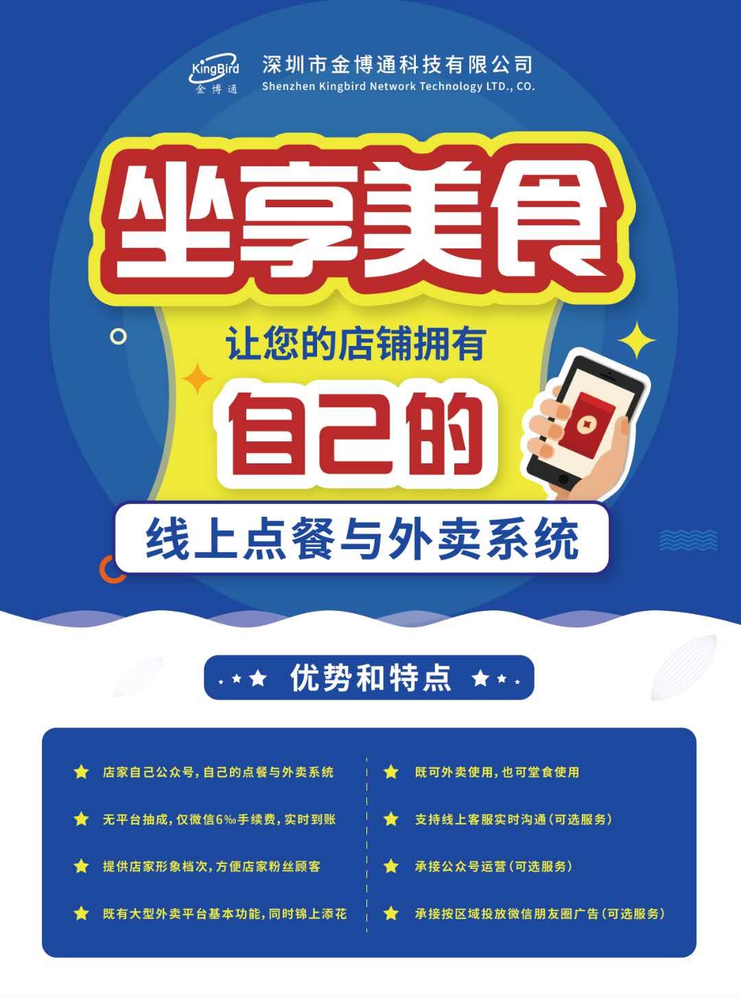 為什么建議你找金博通呢?金博通創(chuàng)建的線(xiàn)上點(diǎn)餐與外賣(mài)系統(tǒng),擁有著獨(dú)一無(wú)二的優(yōu)勢(shì)。利用店家自己的公眾號(hào),幫助店家建立自己的點(diǎn)餐與外賣(mài)系統(tǒng),且該系統(tǒng)既有大型外賣(mài)平臺(tái)的基本功能,還能錦上添花。它不僅可以外賣(mài)使用,也可以堂食使用,還支持線(xiàn)上客服實(shí)時(shí)溝通。重要的是,店家擁有自己的線(xiàn)上點(diǎn)餐與外賣(mài)系統(tǒng)之后,免去了平臺(tái)抽成,只有微信6‰手續(xù)費(fèi),實(shí)時(shí)到賬。此外,為了方便店家留住粉絲和吸引顧客,金博通還提供店家形象檔次服務(wù)以及承接公眾號(hào)運(yùn)營(yíng)、按區(qū)域投放微信朋友圈廣告。